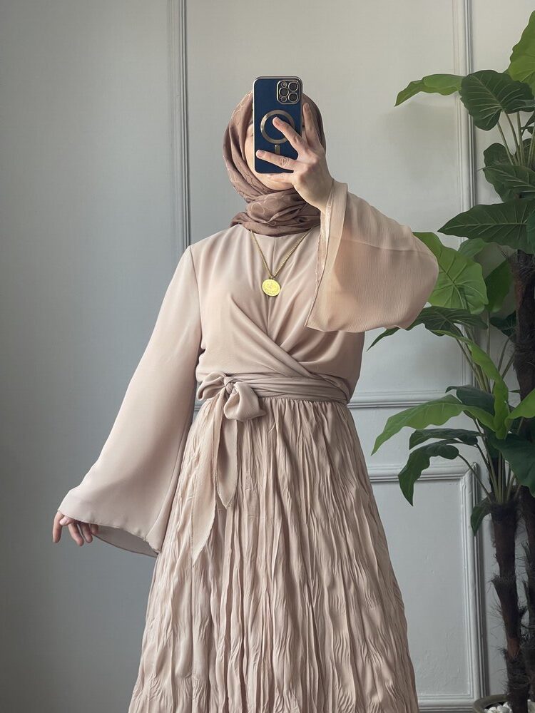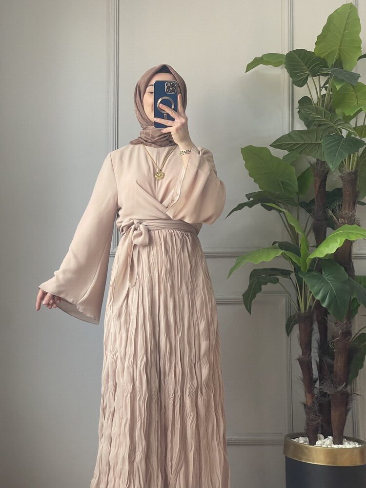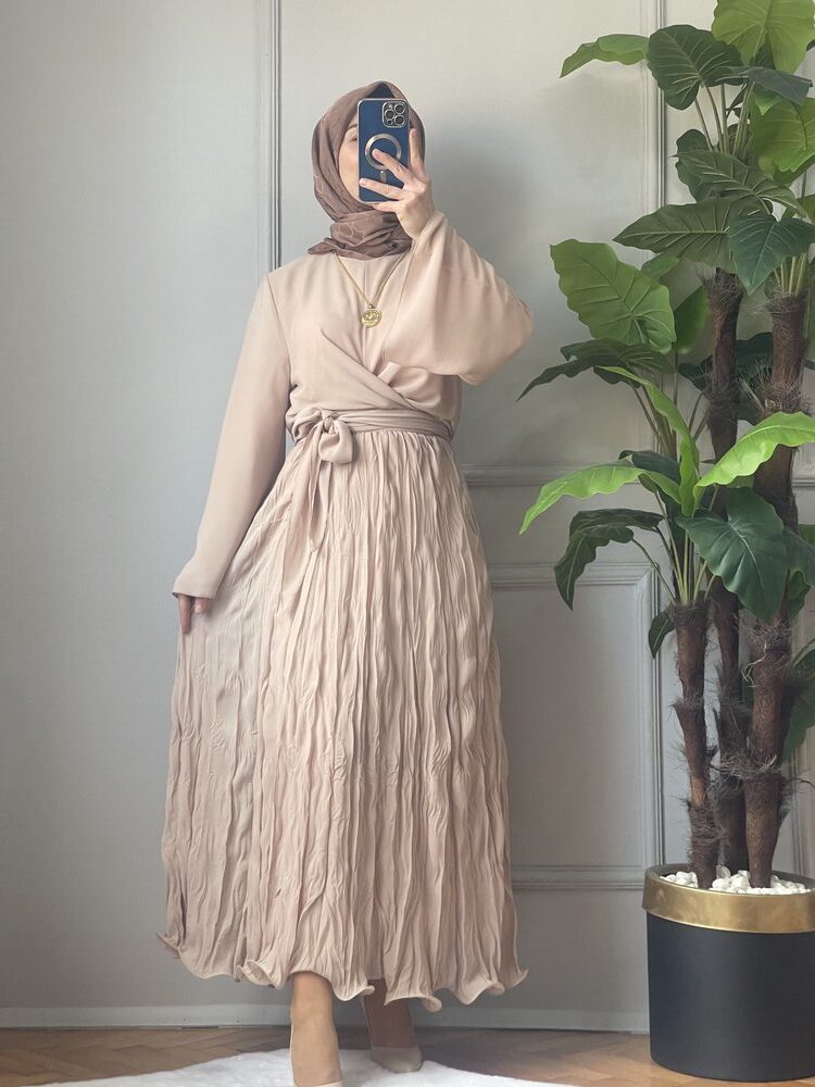 Modern çizgisi ve zarif pudra-bej tonuyla ön plana çıkan Cemre Etekli Takım, A kalite kumaşı ve üstün işçiliğiyle dolabınızın vazgeçilmez parçası olmaya aday. Takım, iç astarı sayesinde iç göstermeyen bir yapıya sahip olup hem etek hem üst kısmıyle tam konfor sağlar. Belden bağlamalı üst tasarımı feminen bir silüet sunarken; pileli dokulu etek ise hareketli ve şık bir görünüm yaratır. Günlük stilinize zarafet katarken özel davetlerde de göz kamaştırır.
