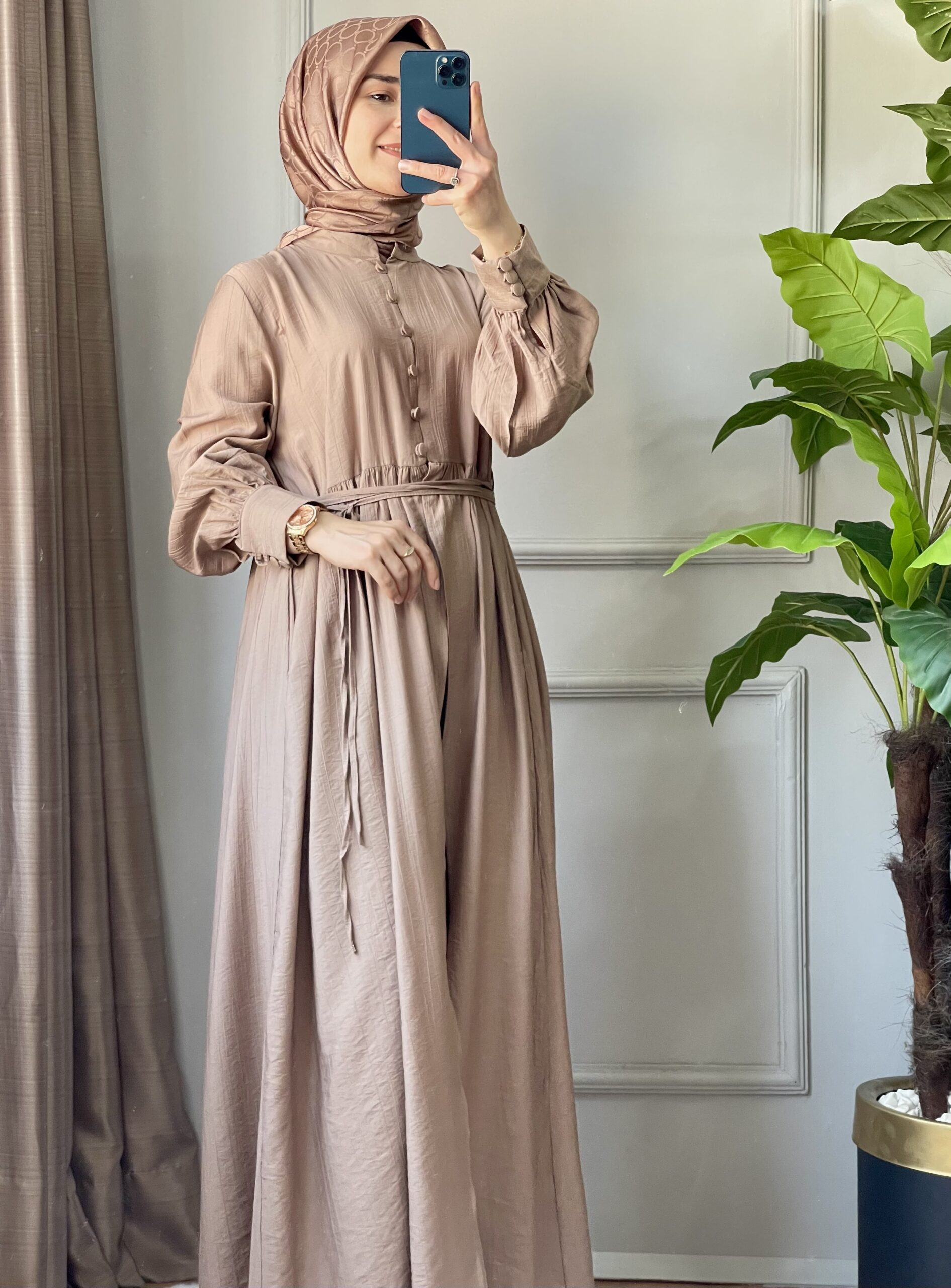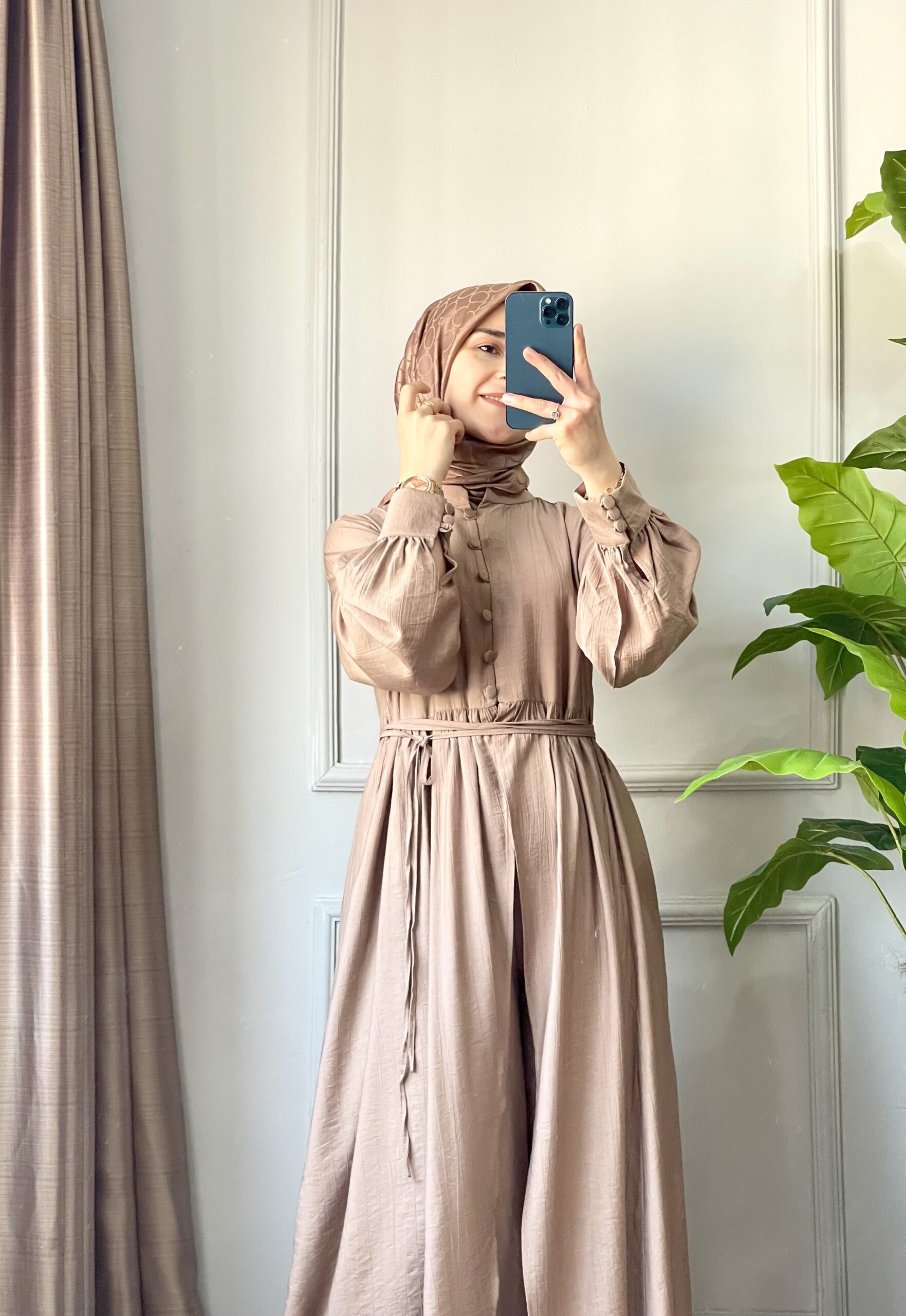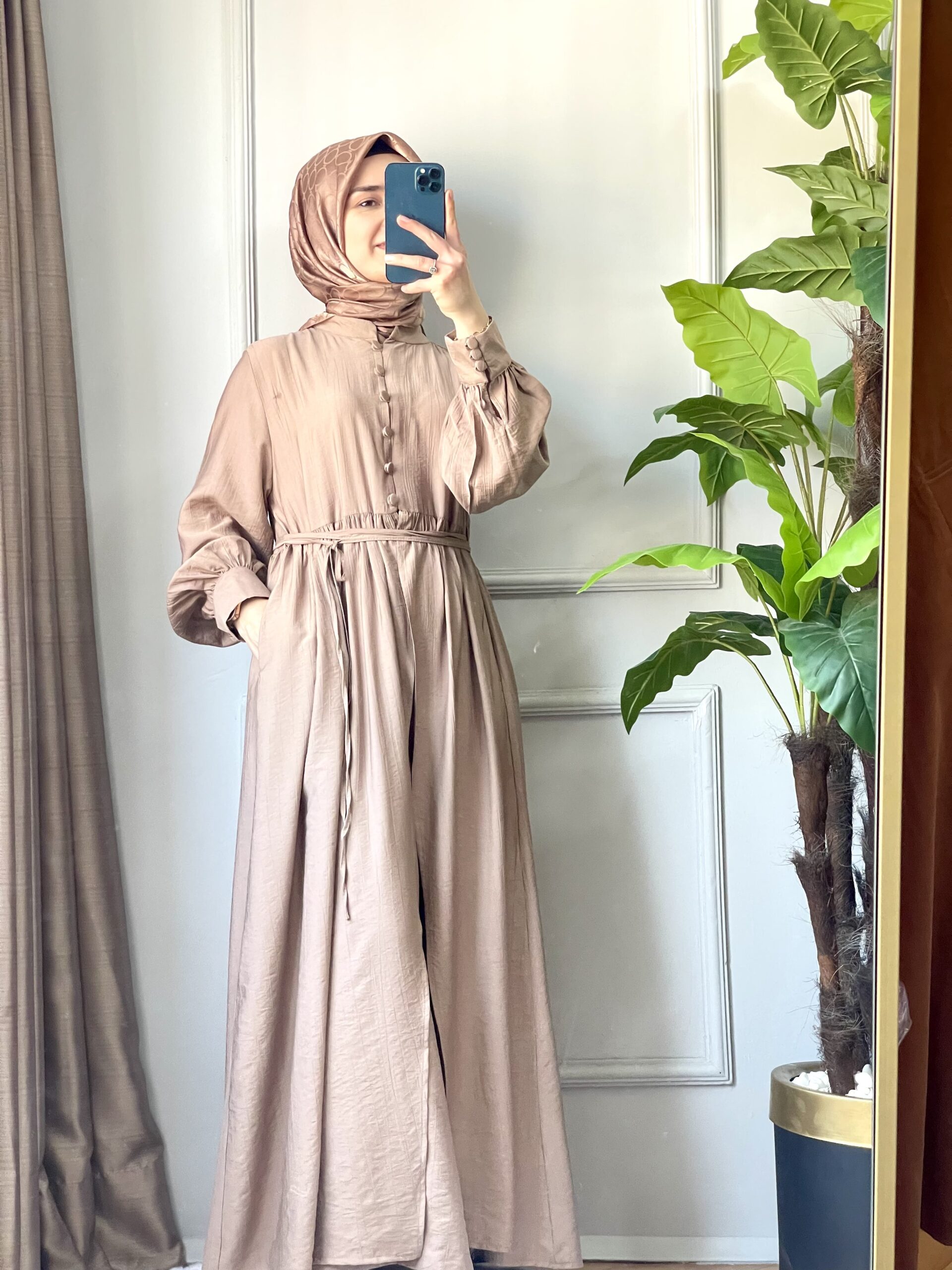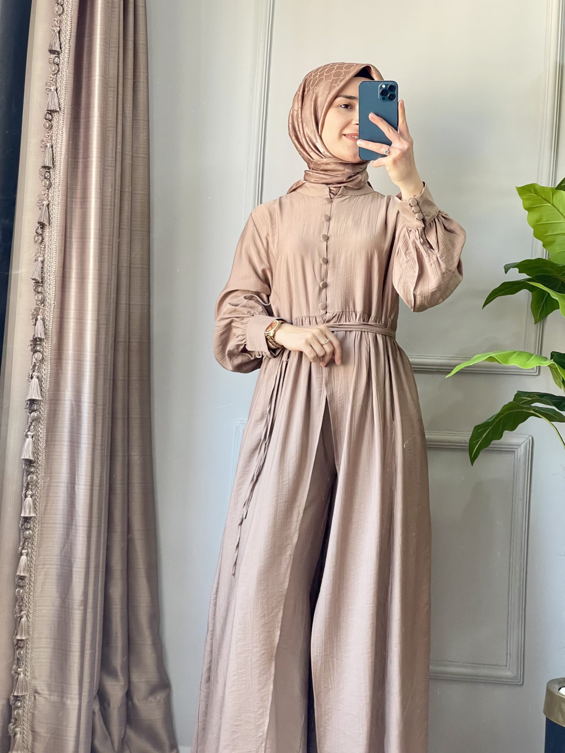 Kahverenginin dingin ve asil duruşuyla tasarlanan Efuli takım, sade detaylarıyla her ortamda kendini gösteriyor. Hakim yaka ve yarım düğmeli tasarımıyla modern; büzgülü beli ve kuşak detayıyla zarif bir görünüm sunar. Pantolon ise cepli, lastikli beli ve geniş paça yapısıyla gün boyu rahatlık sağlar.
