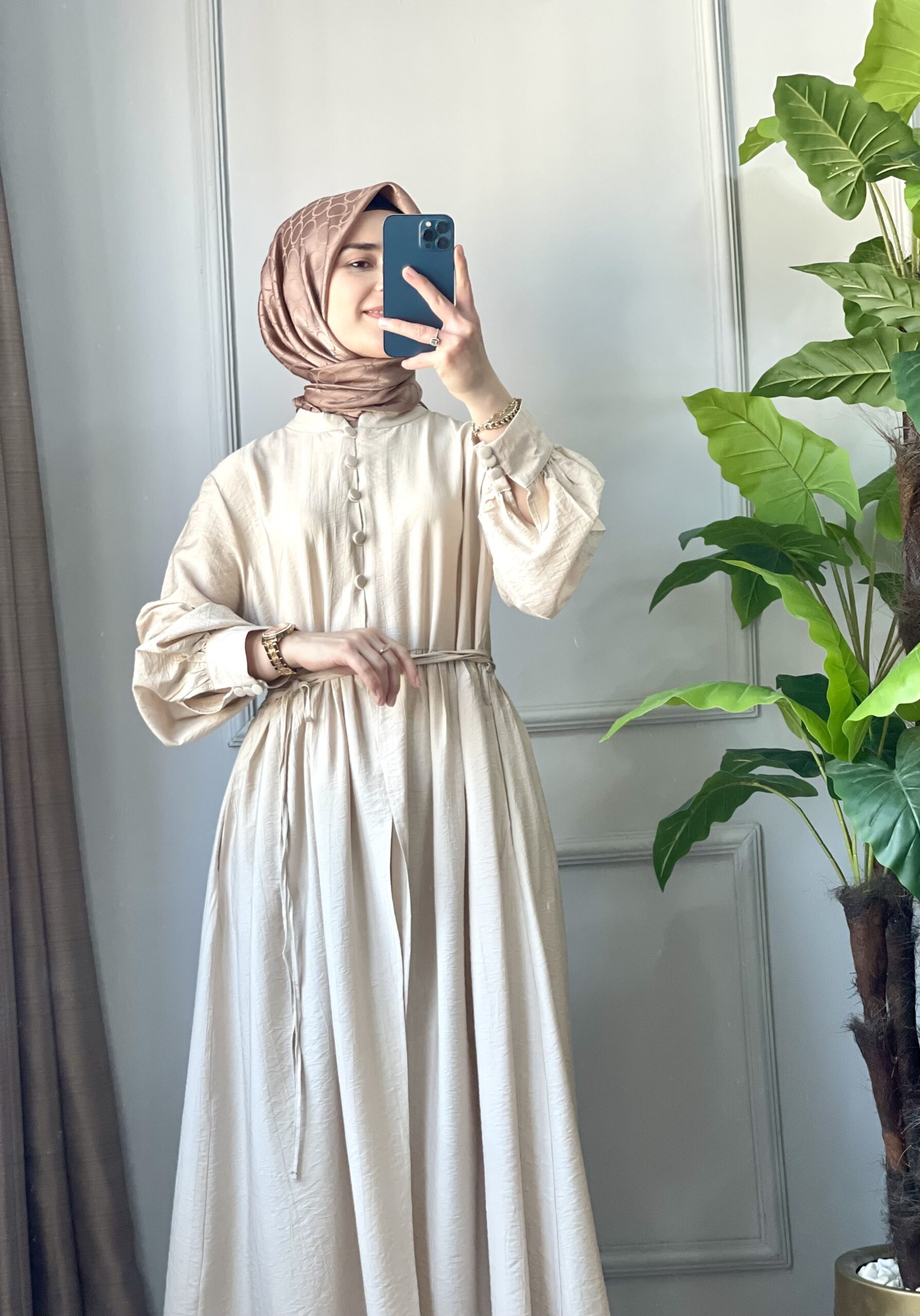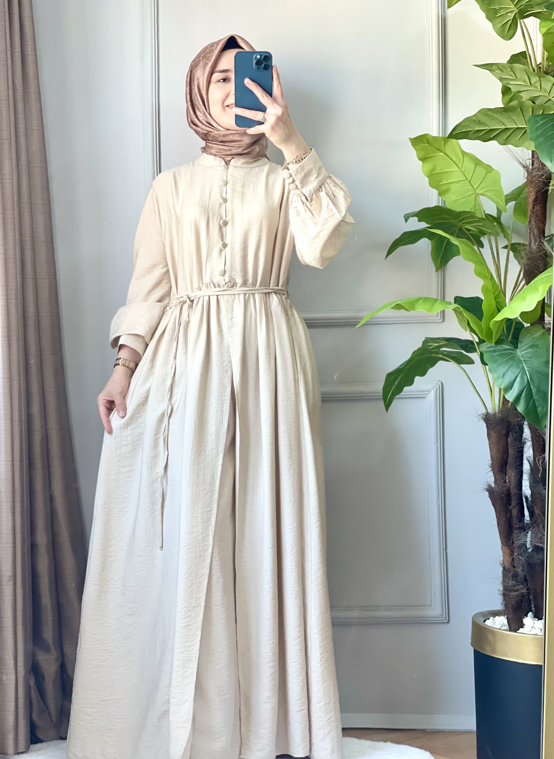 Efuli Takım – Krem Renk Hakim Yaka İkili Tesettür Takım