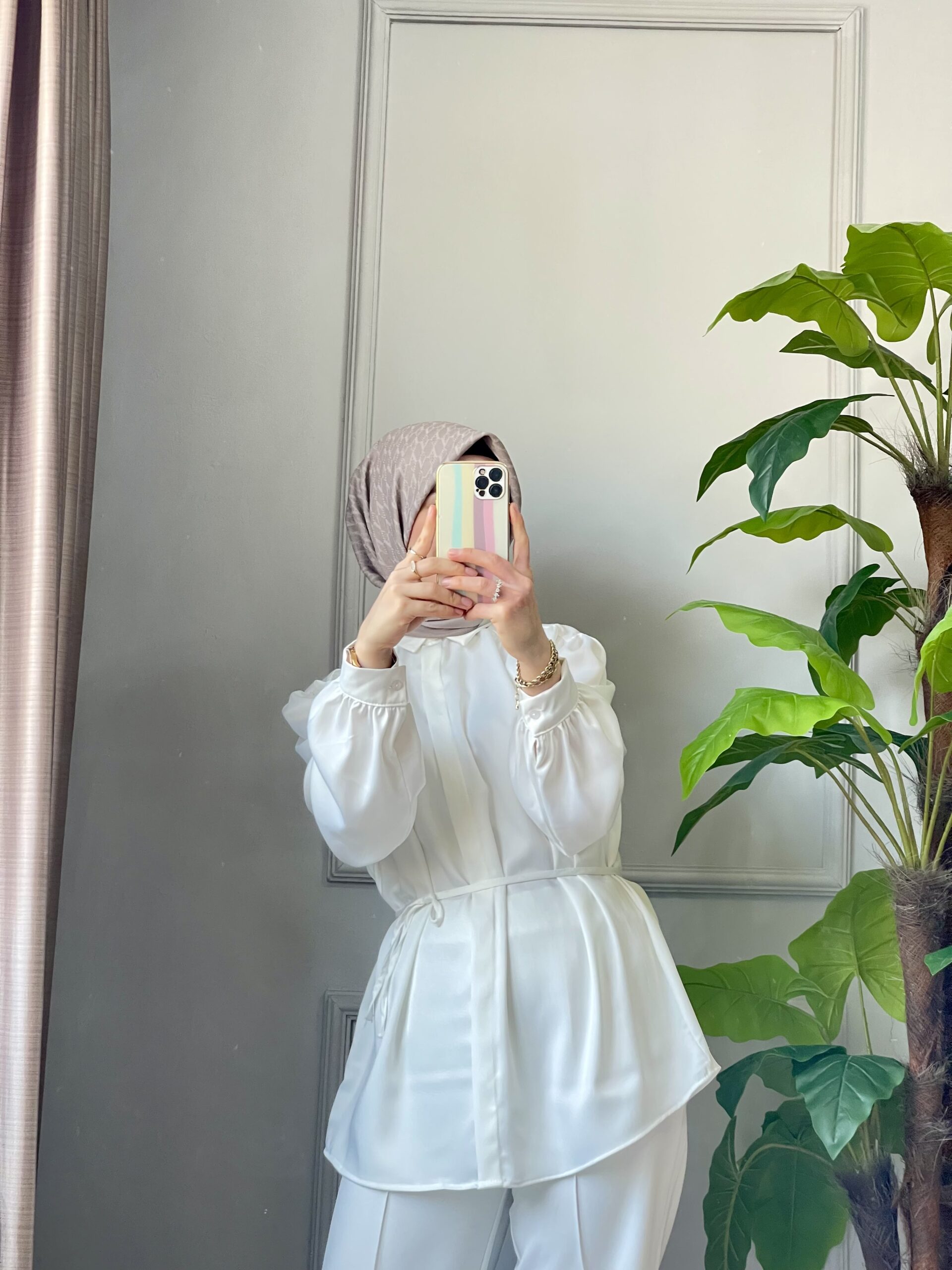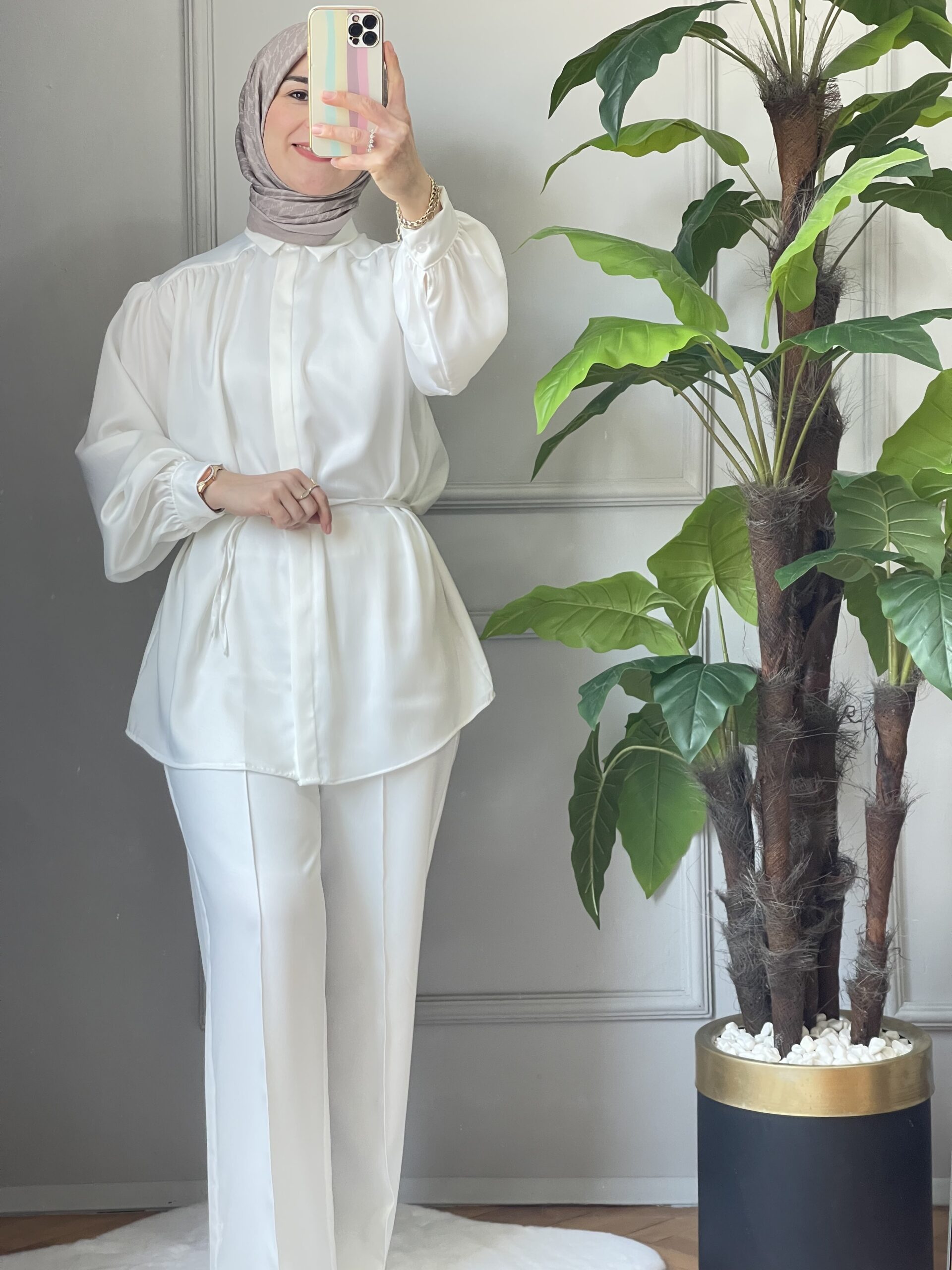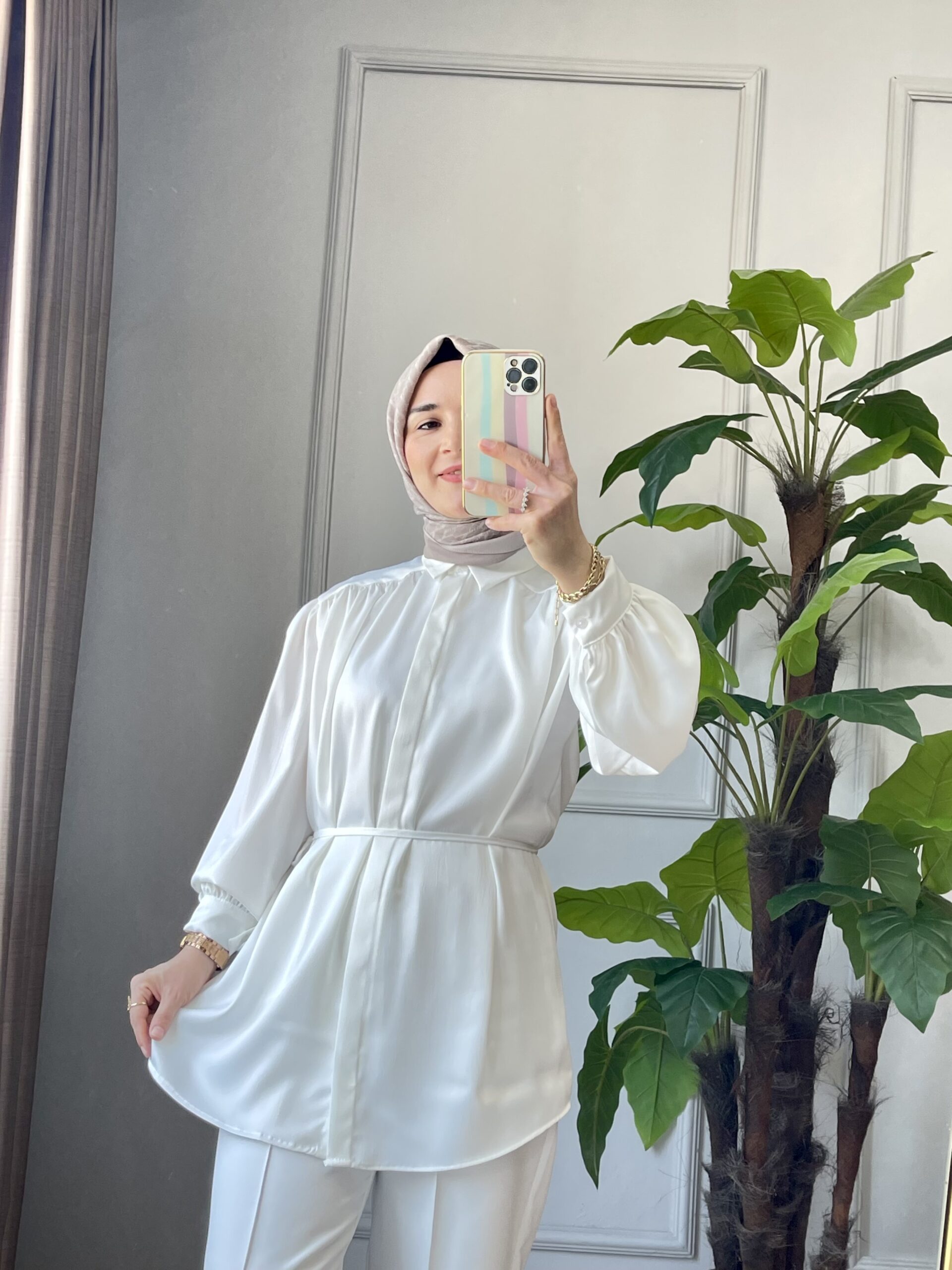 Zarafeti ve şıklığı bir arada sunan İnci Beyazı Saten Gömlek, modern balon kolları ve ince kuşak detayıyla kombinlerinize sofistike bir dokunuş katar. Parlak saten dokusu ile hem günlük hem özel davetlerinizde rahatlıkla kullanabileceğiniz bu parça, zamansız şıklığın anahtarı.