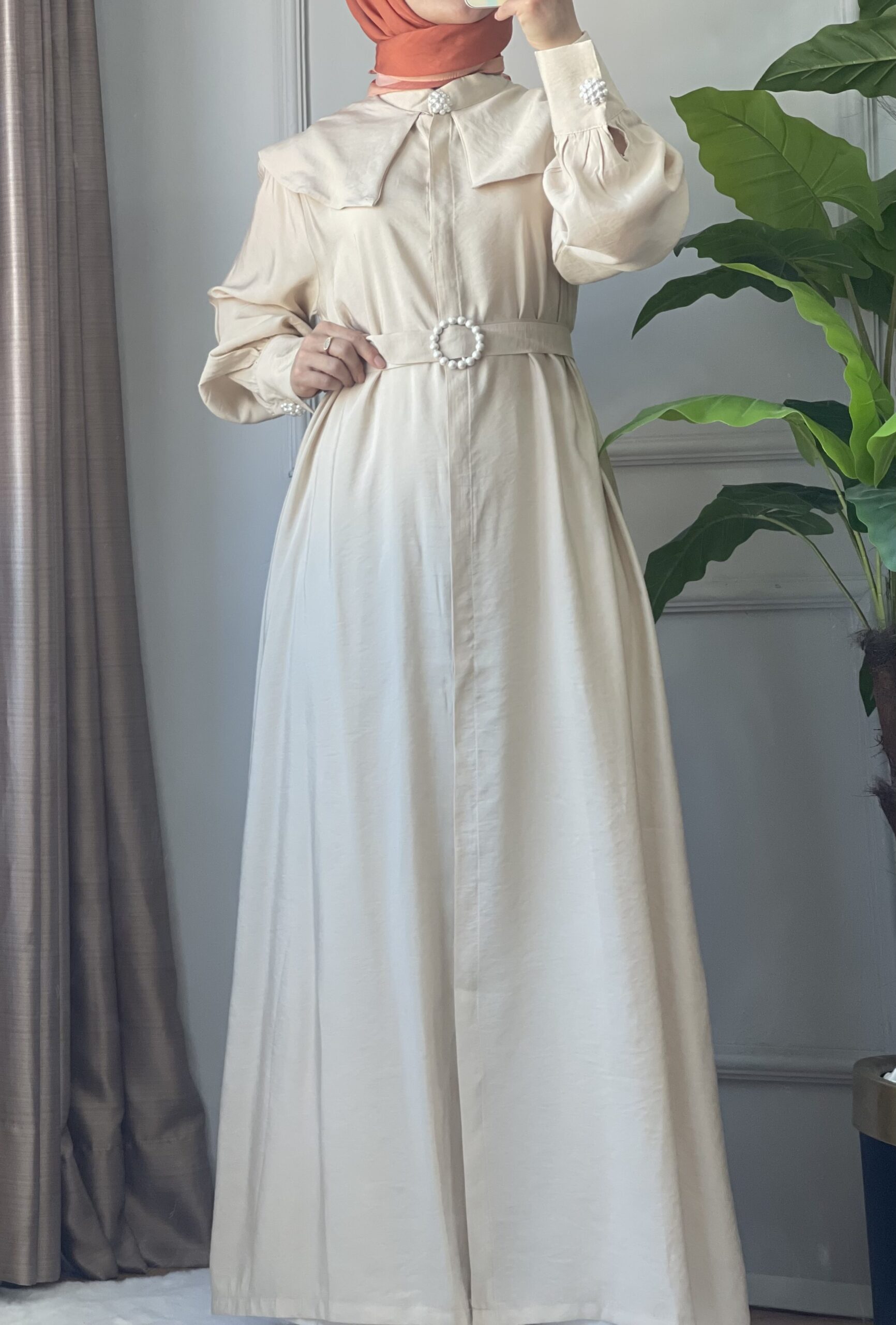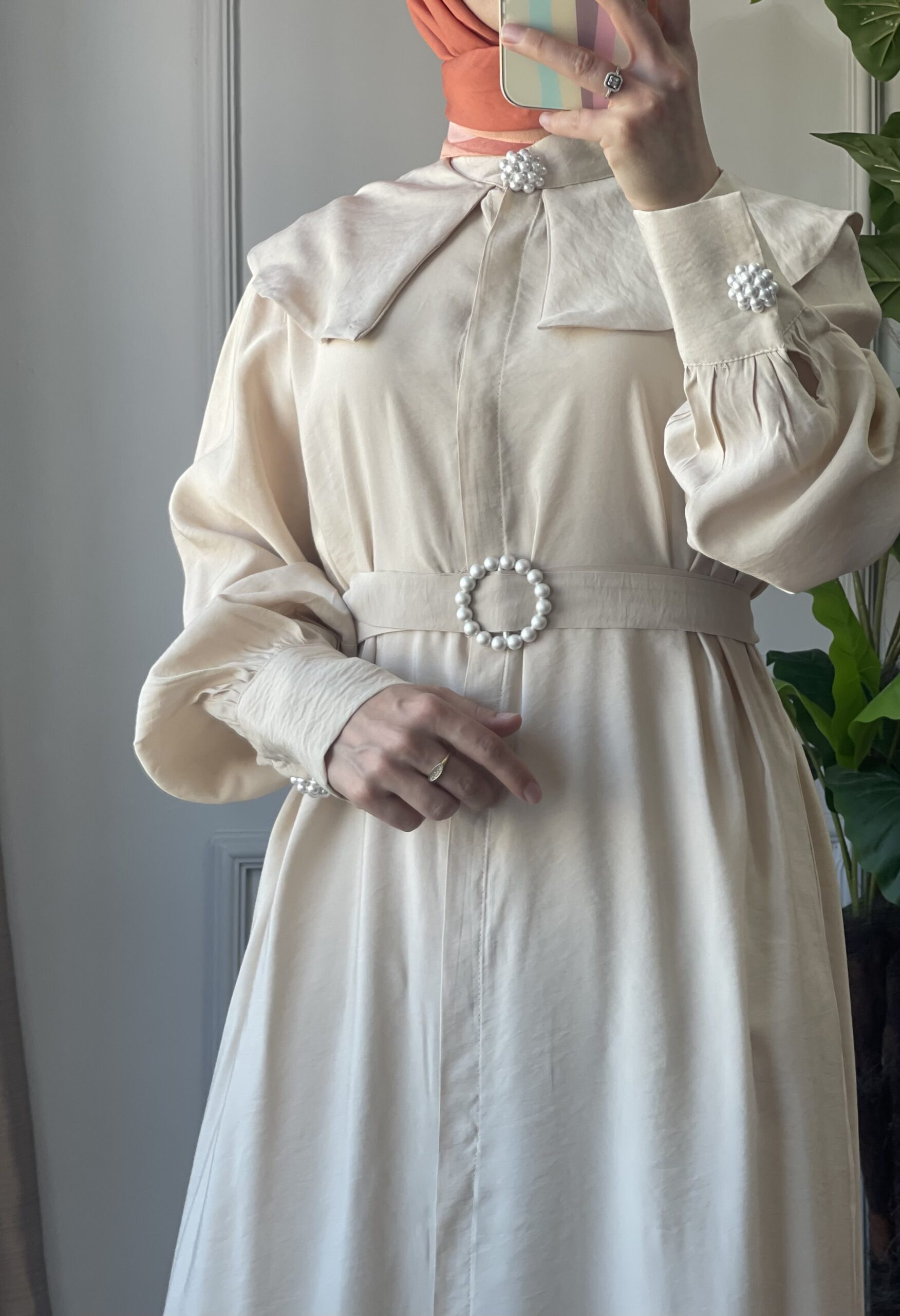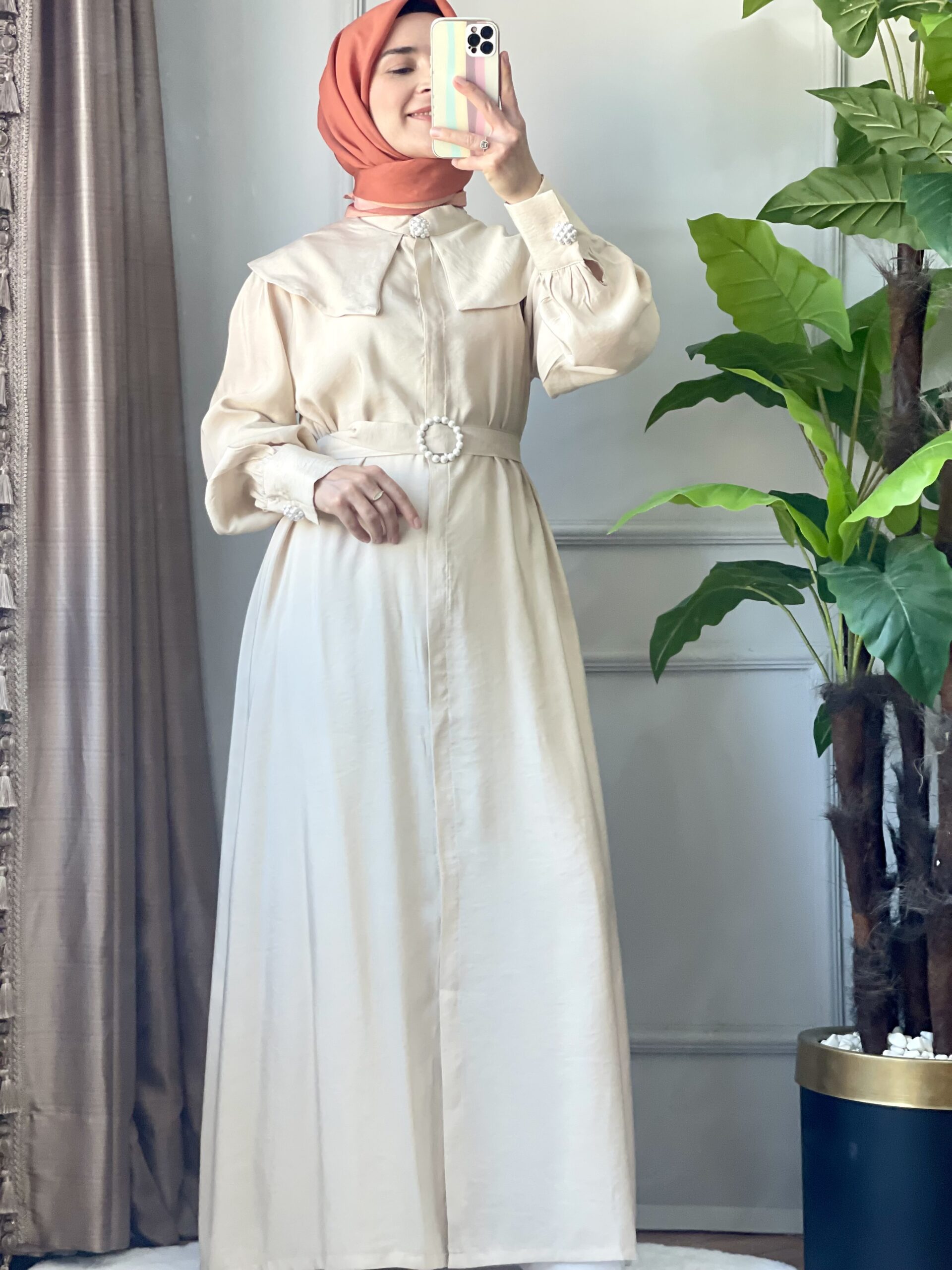 Krem Renkli Pelerin Yaka İnci Detaylı Ferace Elbise