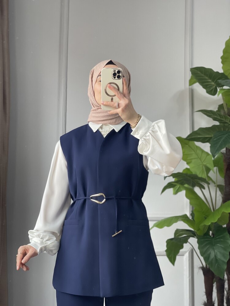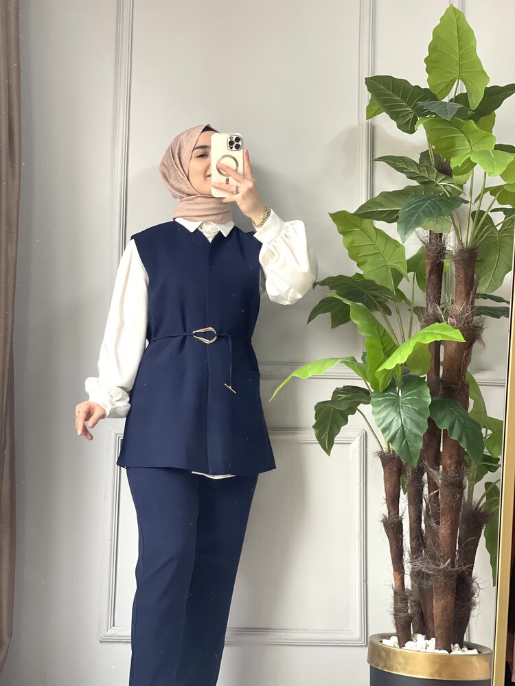 Şıklığı ve konforu bir araya getiren bu lacivert yelekli takım, zarif detayları ve kaliteli kumaşıyla gün boyu stilinizi korumanızı sağlar. Tesettür modasına modern bir dokunuş katmak isteyen kadınlar için özel olarak tasarlandı.